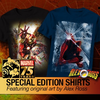 Commemorate 75 years of Marvel Comics with the Iron Man and Spider Man Marvel 75th Special Edition Alex Ross T-Shirts at HeroMart! Featuring everyone’s favorite armored Avenger and web slinger, you don't need to own Stark Industries or wear blue spandex to look like a million bucks!